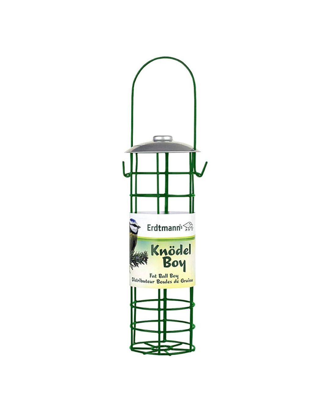 Mangiatoia per palle di grasso con coperchio ribaltabile per un facile riempimento e pulizia. Escluso il manico misura 22 centimetri e il diametro è di circa 6.8 centimetri
